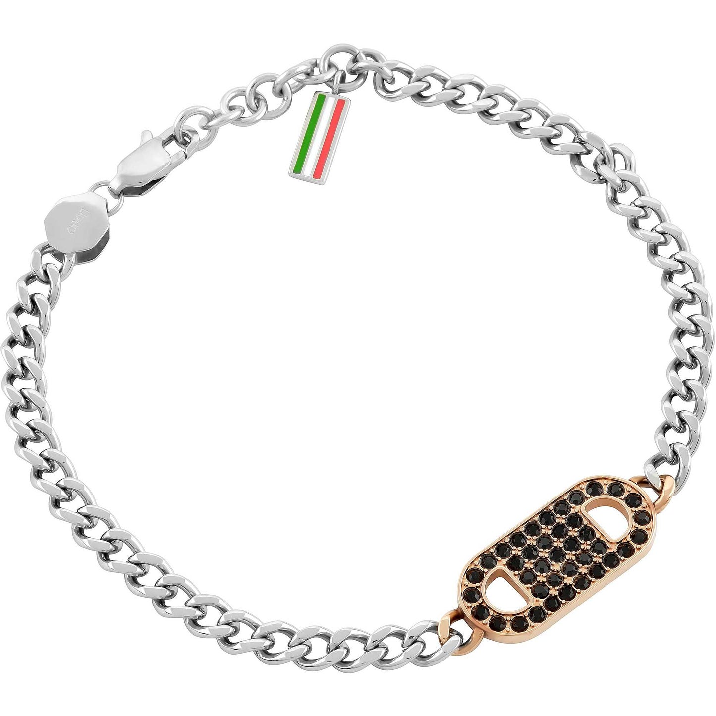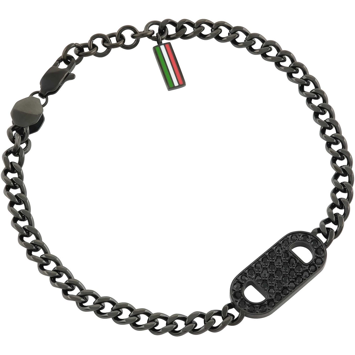 Bracciale uomo in acciaio nichel free con charm a pietrine applicate. Chiusura con moschettone.