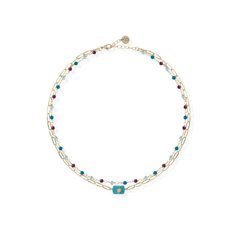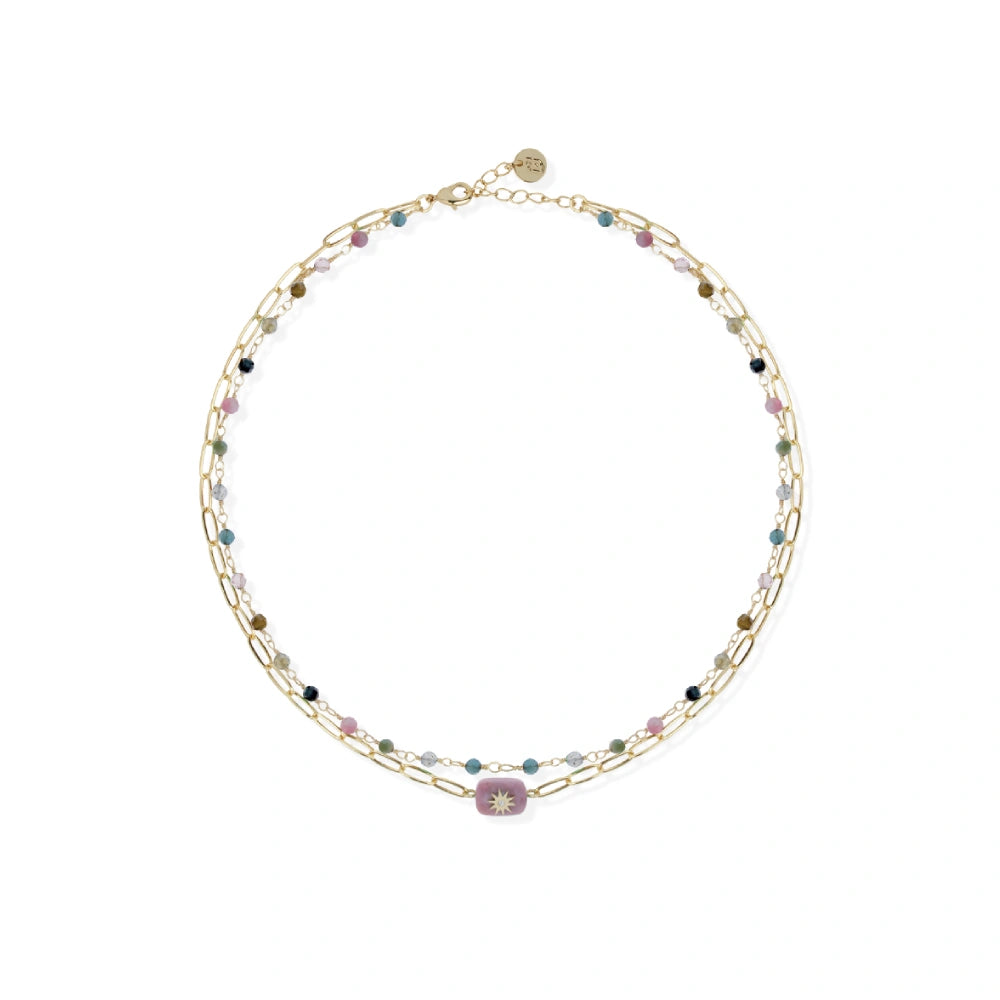 Questa collana Liu Jo è realizzata in acciaio, con pietre colorate e una pietra centrale rosa o turchese per un tocco di eleganza. Il colore oro e la lunghezza di 35 cm la rendono perfetta per completare ogni outfit.