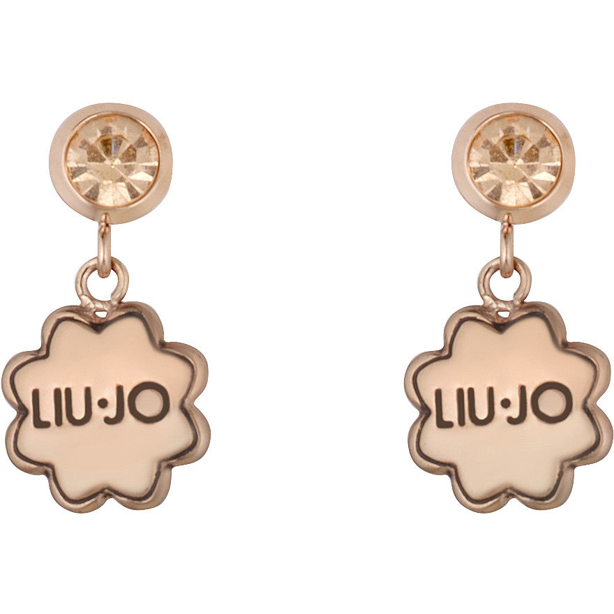 Orecchini in acciaio nichel free a forma di fiore con logo inciso e castoni gioiello. Colore Rosa.