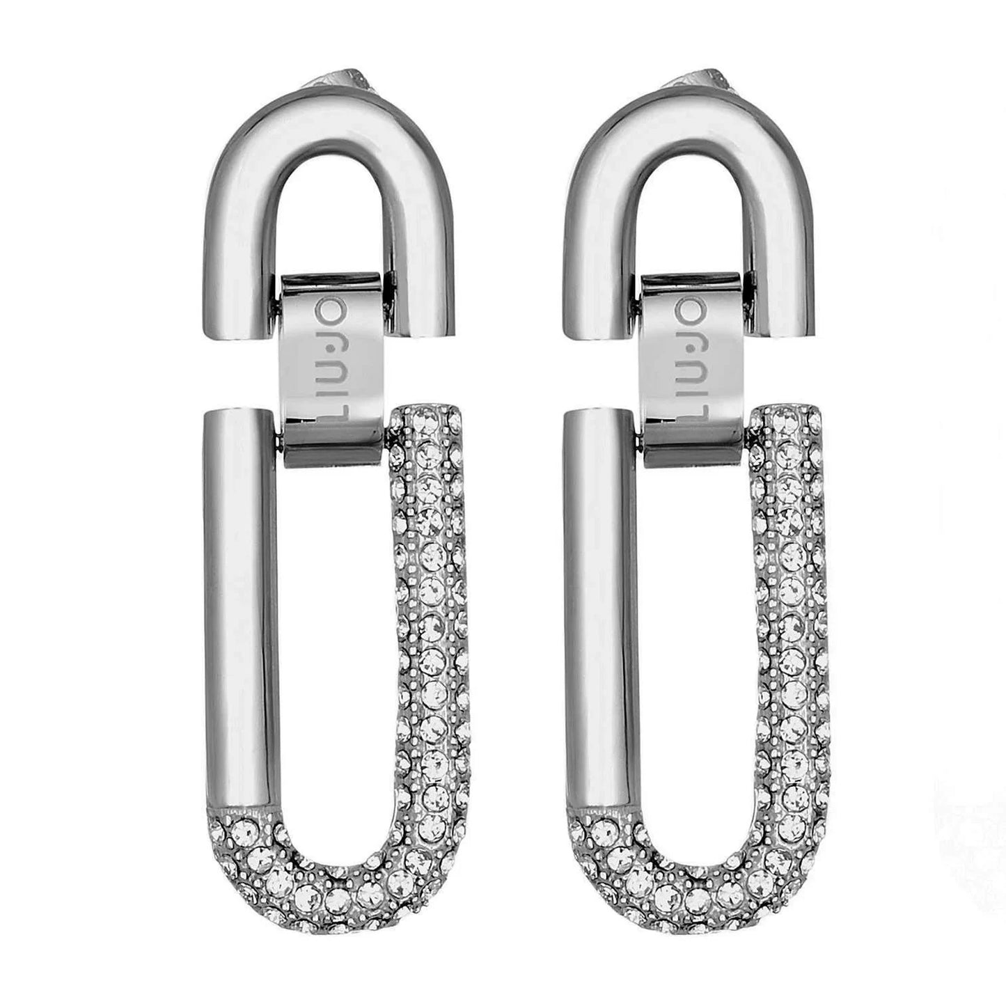 Orecchini in acciaio nichel free a maglia larga con brill applicati. Chiusura a farfalla.
