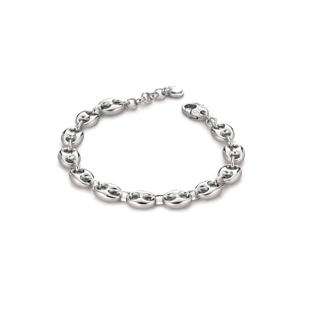 Bracciale in argento 925 con rodiatura bianca, misura 19 cm con estensione di 3 cm. Realizzato a mano in Italia, un gioiello artigianale di qualità e design.