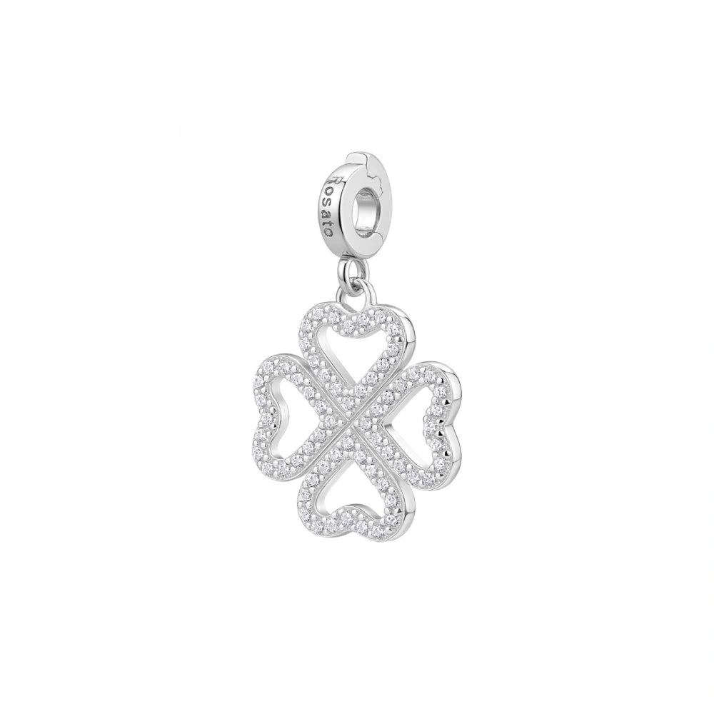 Charm quadrifoglio STORIE in argento, arricchito da 64 cubic zirconia bianchi per un design elegante e luminoso, simbolo di fortuna e stile raffinato.