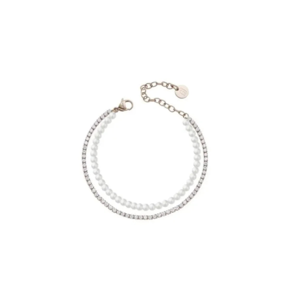 Bracciale in acciaio, impreziosito da perline sintetiche e cubic zirconia che riflettono la luce con eleganza. Un design raffinato che combina armonia e brillantezza contemporanea.
