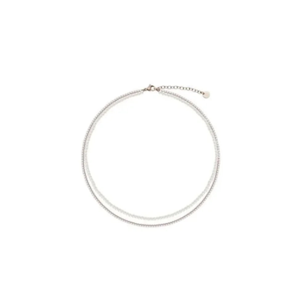 Collana doppio filo in acciaio, arricchita da perline sintetiche e cubic zirconia che creano un delicato gioco di luci. Un design elegante e contemporaneo dal fascino raffinato.