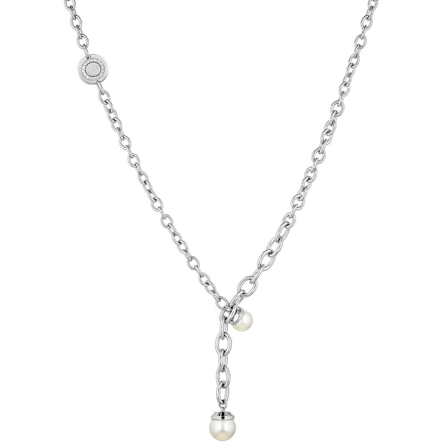 Collana in ottone bianco a catena con perle gioiello. Chiusura con moschettone.